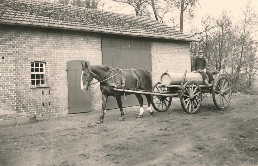 Hier sind noch 2 Aufnahmen von geschätzt 1930. Damals war das 700l Güllefass der ganz Stolz des Besitzers. Das andere Bild zeigt die Arbeiter beim Kartoffeldämpfen. Diese Dampftöpfe wurden auf einen Wagen herangeschafft und dann durch die Kartoffeln kochender Wasserdampf geleitet. Ungefähr so, wie unsere heutigen Schnellkochtöpfe. Die heißen Kartoffeln wurden in einen Silo geschüttet und mit speziellen Holzschuhen mit hohen Lederschutz zerstampft. Das war dann das Winterfutter für die Schweine. 1957 wurde von der Dreschgenossenschaft Niederoesterweg ein moderner Kartoffeldämpfer angeschafft. Dazu mehr auf den Seiten von Achelpöhler.