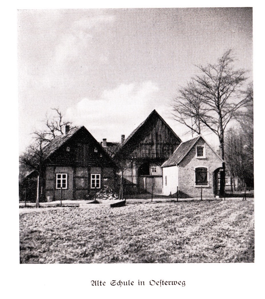 Hier eine Ansicht der Schule deutlich nach 1910, wahrscheinlich aus den 1930er Jahren. Das Bild ist dem Buch „Jugendjahre in Westfalen“ entnommen. Dieses Buch ist von Hermann Kämper geschrieben und schildert seine Erinnerung als Lehrerssohn an Oesterweg in den Jahren 1854 - 1870. Herausgegeben wurde das Heft von Otto Kämper im Jahre 1932. Damit gibt es einen einzigartigen Einblick in das damalige Dorfleben von Oesterweg.