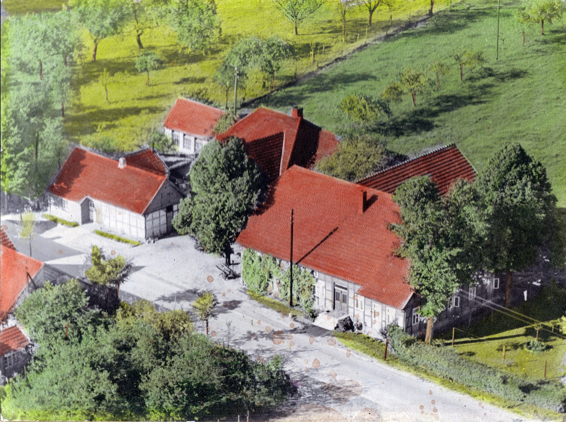 Diese Luftaufnahme zeigt die Hofstelle 111 (Uthmann, Brinkmann) mit der angrenzenden Schmiede und dem dazugehörigen Kotten. Dahinter noch ein kleiner Hühnerstall. Vorne links im Bild ist noch ein Teil der Scheune von Herbert Strahtkötter zu sehen, im Hintergrund eine alte Obstbaumwiese. Der Kotten wurde ca. 1970 abgerissen.