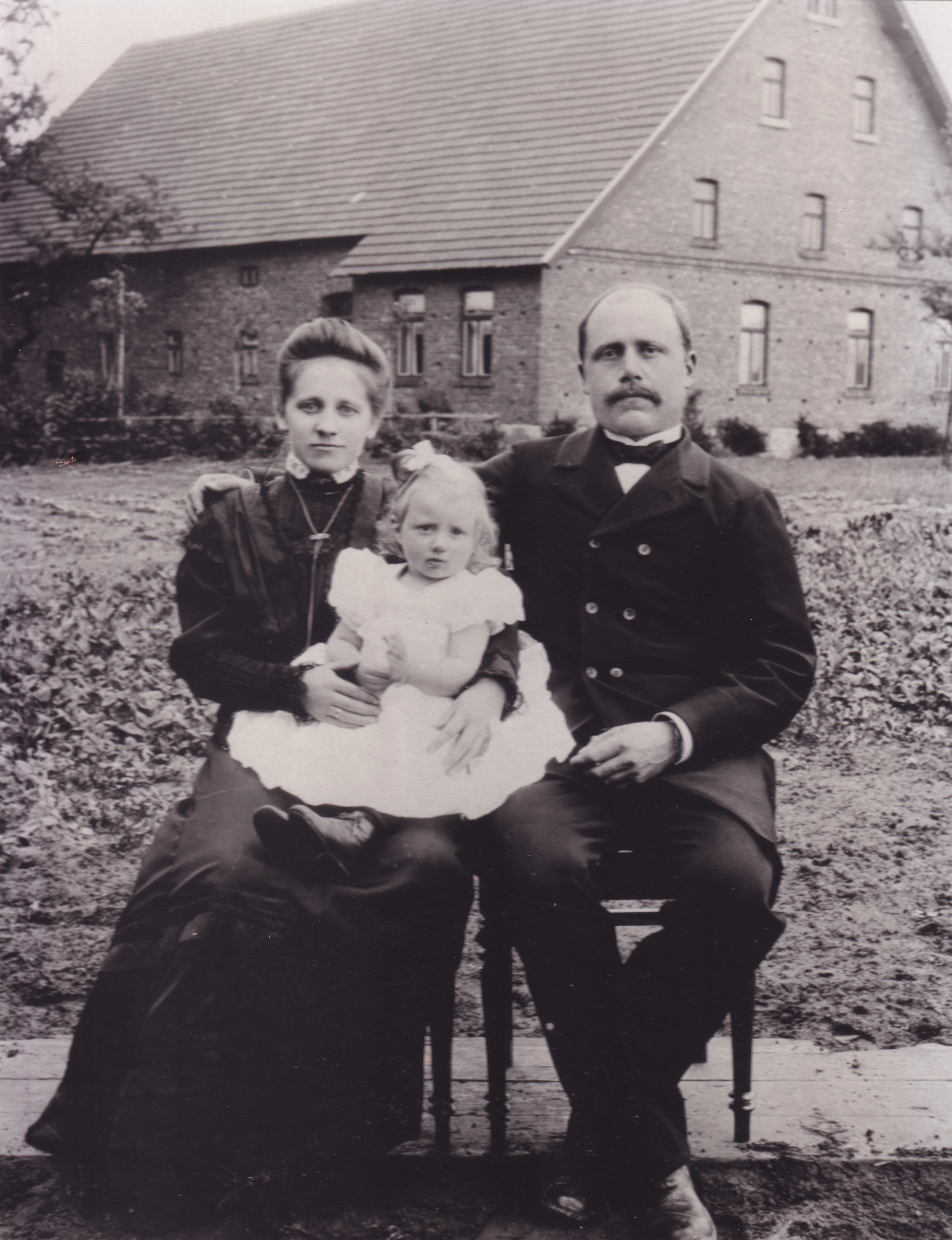 Auf dem Bild sehen wir Auguste Stricker, Tochter Alma und Heinrich Wilhelm Stricker. Willi ist noch nicht geboren. Kurz darauf stirbt Wilhelm Stricker. Auguste heiratet danach nochmals. Ihr Ehemann wird Heinrich Ruschhaupt aus Hesselteich. Der führt dann bis 1960, seinem Todesjahr den Hof.