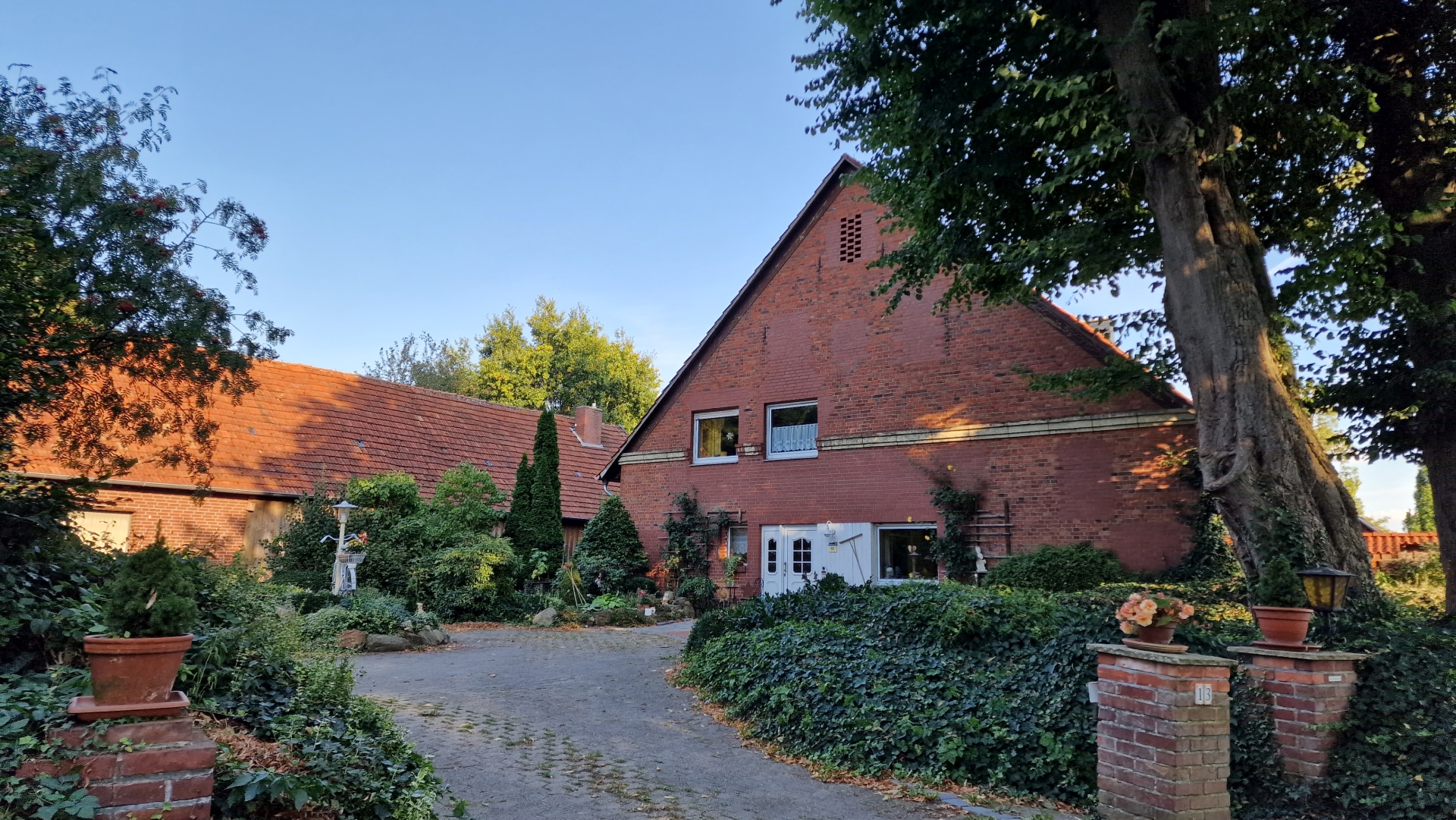 Das Haupthaus im Hintergrund wird 1904 als Steinhaus neu gebaut. Vorher hat wohl ein alter Kotten etwas versetzt gestanden der dann abgebrannt ist, aber davon gibt es keine Unterlagen mehr. Später ist noch eine Scheune mit Schweinestall gebaut worden. Quer davor war noch ein großer Hühnerstall, von dem Auguste Stricker damals sagte, es sei der größte in Oesterweg. Heinrich Ruschhaup war begeisteter Landwirt und hielt eine Menge unterschiedlicher Tiere auf dem Hof. 10-12 Kühe, Bullen, Kälber, Rinder, 2 Pferde, Schafe, Tauben, Bienen und vor allem auch Hühner. Vor und rund ums Haus standen enorm viele Obstbäume, die ebenfalls der Versorgung dienten.