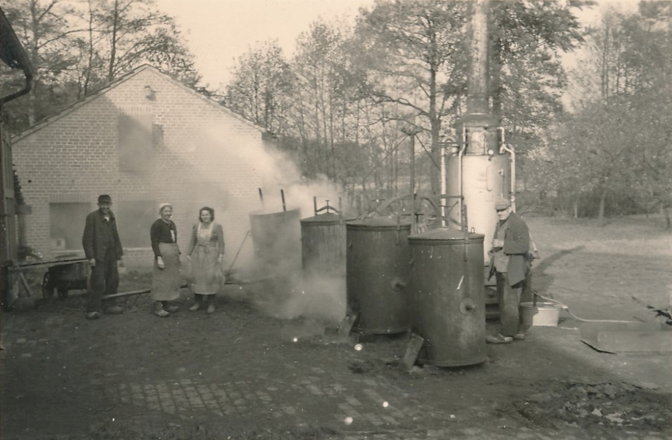Hier sind noch 2 Aufnahmen von geschätzt 1930. Damals war das 700l Güllefass der ganz Stolz des Besitzers. Das andere Bild zeigt die Arbeiter beim Kartoffeldämpfen. Diese Dampftöpfe wurden auf einen Wagen herangeschafft und dann durch die Kartoffeln kochender Wasserdampf geleitet. Ungefähr so, wie unsere heutigen Schnellkochtöpfe. Die heißen Kartoffeln wurden in einen Silo geschüttet und mit speziellen Holzschuhen mit hohen Lederschutz zerstampft. Das war dann das Winterfutter für die Schweine. 1957 wurde von der Dreschgenossenschaft Niederoesterweg ein moderner Kartoffeldämpfer angeschafft. Dazu mehr auf den Seiten von Achelpöhler.