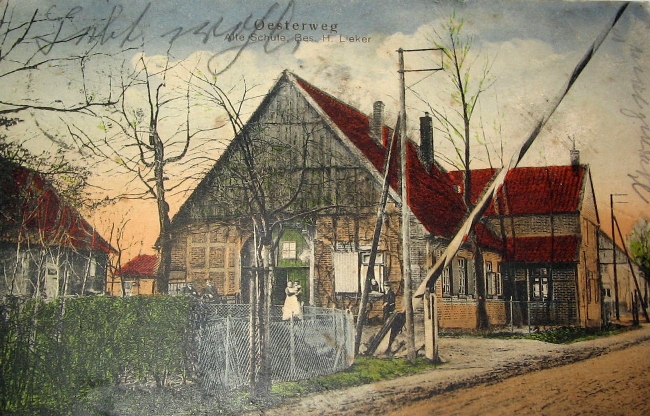 Auf der Postkarte ist ein Schlagbaum zu erkennen. Der Schlagbaum wurde von Gustav Lieker verwaltet. Dieser hatte die alte Schule erworben. Ihm gehörte zusätzlich die Wirtschaft auf der gegenüberliegenden Straßenseite (Gaststätte Zur Dicken Linde, alt Oesterweg Nr. 127)