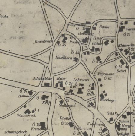 Auf dem Hof Oesterweg Nr. 45 ist seit 1720 die Familie Damme gelistet. 1898 heiratet Friedrich August Grambrock die Maria Damme und der Hof steht seitdem unter dem Namen Grambrock. Der letzte Eintrag in der Genealogie des Hauses finden wir 1925, wo Friedrich Grambrock eine Lina Godejohann aus Oesterweg heiratet. Sie haben 3 Kinder.