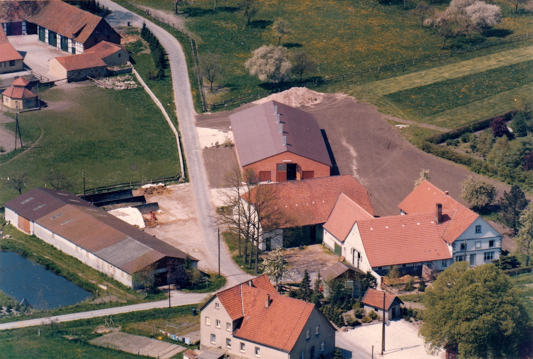 Hier ist eine Luftaufnahme des Anwesen um 1980 herum. Der neue Kuhstall ist gebaut und die Straße ist noch öffentlich und mündet in die Lange Straße. Der Weg wird im Zuge der Flurbereinigung privatisiert und für den Durchgangsverkehr gesperrt.